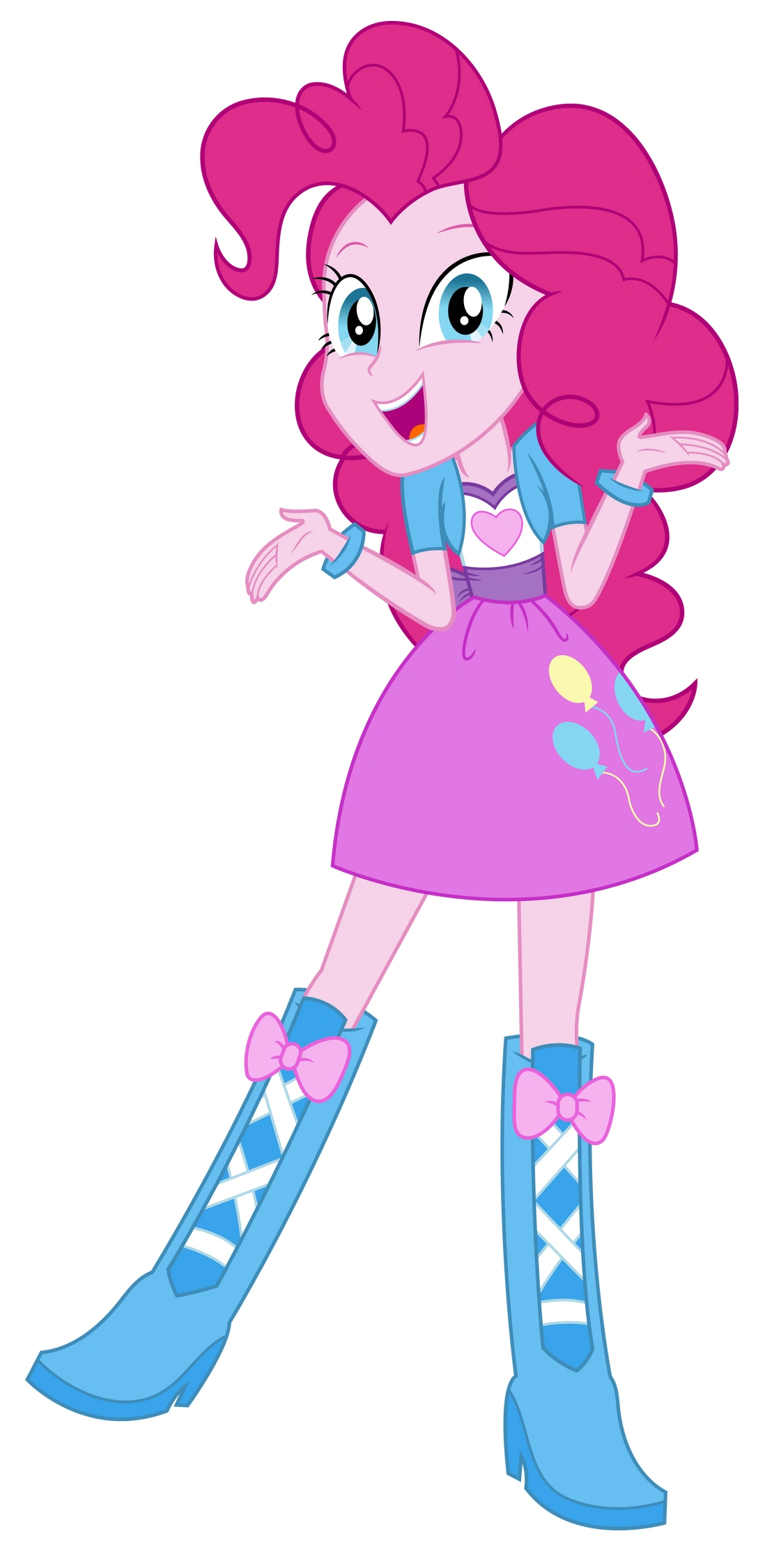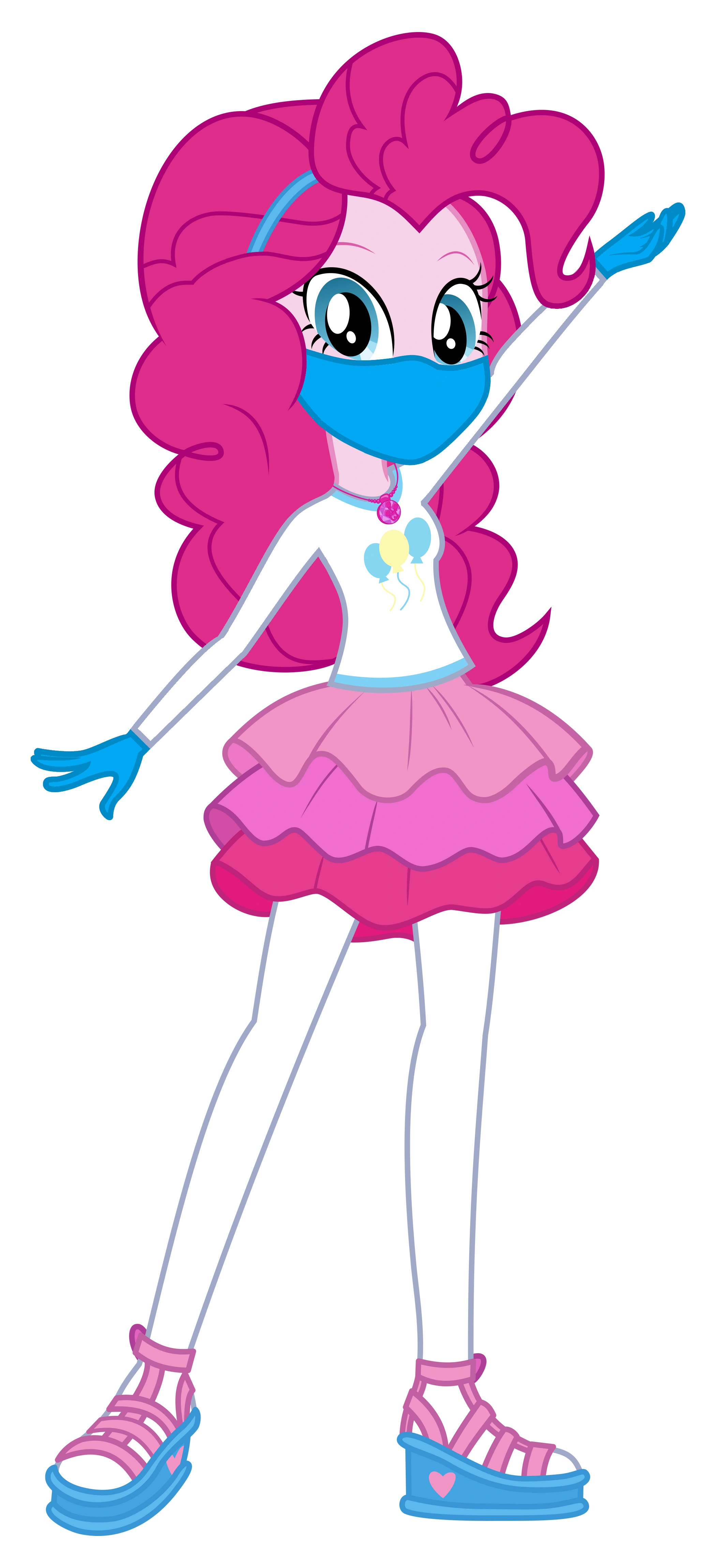 Pinkie Pie shares many of her pony counterpart's character traits and cartoonish quirks, including having a very cheerful and sociable personality and performing various comedic gags. At one point in the first film, she picks one of the balloon patterns off her skirt and inflates it like an actual balloon.